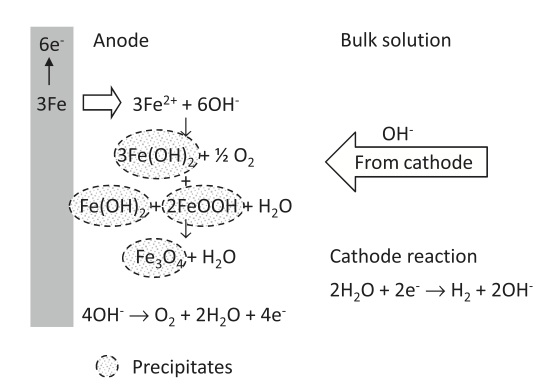 Hence, the mechanisms of formation of Fe3O4 can be described as follows. Fe2+ ions produced by iron oxidation at anode react with OH– ions coming from water reduction at cathode. Fe(OH)2 is then partially oxidized by O2 produced by water oxidation at anode to form FeOOH. Fe3O4 is formed when an appropriate proportion of Fe(OH)2 and FeOOH is created. The overall mechanism may be illustrated schematically below (Fajaroh et al, Adv. Powder Technol., 23, 328-333, 2012).