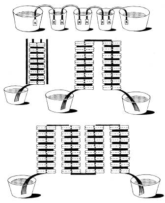 Pada tahun 1802, Dr. William Cruickshank merancang baterai listrik pertama yang dapat diproduksi secara masal. Cruickshank menyusun lembaran tembaga persegi, yang disolder pada ujungnya, bersama-sama dengan lembaran seng yang berukuran sama. Lembaran ini ditempatkan pada kayu persegi panjang yang direkatkan dengan semen. Lekukan dalam kotak menahan pelat logam pada posisinya. Kotak ini kemudian diisi dengan elektrolit garam jenuh atau asam.