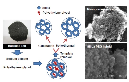 Keywords: Bagasse ash; Mesoporous silica; Sodium silicate; PEG template; Silica-PEG hybrid.