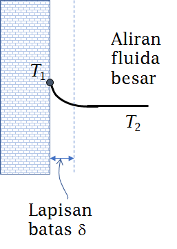 - Fluida besar diluar lapisan tipis bercampur sempurna oleh aliran turbulent, yang suhunya adalah T2, berbeda dengan suhu dinding T1.