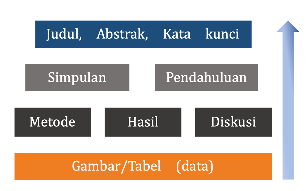 Kemudian bagaimana proses membangun sebuah artikel? Urutan menulis artikel tidak sama seperti ketika membacanya. Untuk sebagian besar bidang ilmu, cara yang paling efisien adalah memandang naskah sebagai sebuah dinding, dan membangunnya bata demi bata, seperti ditunjukkan pada Gambar 1. Langkah pertama adalah membuat tabel dan gambar, lengkap dengan keterangan/judul gambar. Kemudian baru menguraikan Metoda yang digunakan, Hasil yang ditemukan dan Pembahasan sekitar hasil tersebut. Kesimpulan harus mengalir dengan baik dari sini dengan mudah. Setelah itu baru menulis Pendahuluan, untuk menunjukkan dimana kerja penelitian yang sedang ditulis ini berada didalam bidang ilmu terkait secara keseluruhan. Terakhir, baru ditulis Judul, Abstrak dan Kata kunci. Proses membangun artikel ini lebih mudah, lebih masuk akal dan lebih efektif daripada mencoba menulis sebuah artikel dengan urutan seperti ketika membacanya.