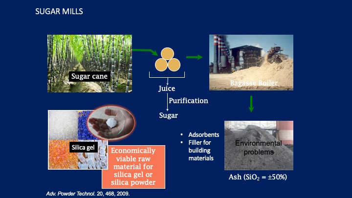 Pabrik gula yang memproses tebu menjadi gula dan sisa ampasnya dijadikan bahan bakar boiler yang menyisakan abu. Abu bagasse yang mengandung silika cukup tinggi dapat diolah menghasilkan silica gel atau bahan silika fungsional lain.