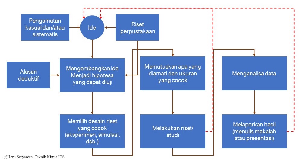 Meskipun sulit untuk dibagi secara jelas, barangkali penelitian dapat dikelompokkan menjadi: (i) dasar, (ii) strategis, (iii) terapan, dan (iv) pengembangan percobaan dan alih teknologi, yang meliputi kapasitas inovasi dan supervisi (baca disini). Apapun jenis penelitiannya, langkah pertama dan utama dalam penelitian adalah memilih dan mendefinisikan masalah penelitian dengan tepat. Seorang peneliti harus mampu mencari ide masalah dan merumuskannya dengan baik sehingga menjadi rentan untuk diteliti. Secara umum, proses penelitian dapat digambarkan seperti Gambar 1. Sebagai peneliti, kemampuan melaksanakan penelitian yang mendalam dan akurat sambil mengkomunikasikan hasil dengan jelas adalah sangat penting. Ini akan sangat membantu dalam membuat keputusan. Tahu dimana dan bagaimana mencari berbagai informasi akan sangat membantu seseorang menyelesaikan masalah yang dihadapi, baik sebagai akademisi maupun karir profesional.