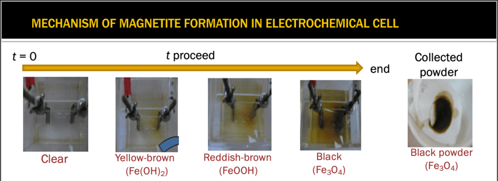 Dari pengetahuan yang didapat di atas, dirancanglah percobaan untuk mensitesa nanopartikel magnetite dalam sel elektrokimia dengan anoda dan katoda besi dalam elektrolit air. Setelah berkali-kali mengalami kegagalan, akhirnya nanopartikel magnetite berhasil terbentuk meskipun untuk mendapatkan beberapa gram butuh waktu yang sangat lama. Pertanyaan berikutnya adalah bagaimana mekanisme pembentukannya? Mengapa bisa terbentuk? Pada kondisi apa bisa terbentuk? Apakah kapasitas produksinya bisa ditingkatkan? Untuk menjawab pertanyaan-pertanyaan tersebut, penelitian tentang topik ini terus berlanjut sampai saat ini di laboratorium kami. Beberapa hasil telah berhasil dipublikasikan di jurnal internasional berfaktor dampak WoS (WoS impact factor) dan terindeks Scopus Q1 sebagai berikut:
