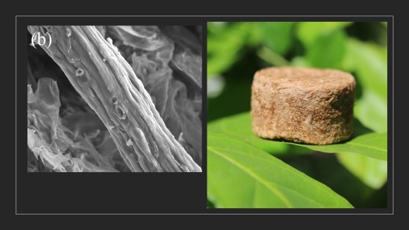 Gambar 2. Aerogel selulosa: citra SEM (kiri) dan foto di atas daun dimana daun mampu menahan tanpa melengkung karena beratnya yang sangat ringan (kanan).