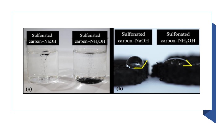 Selulosa dapat diubah menjadi karbon dengan proses pirolisis. Dengan mengatur kondisi pirolisis yang tepat, struktur aerogel selulosa dapat dipertahankan untuk memperoleh aerogel karbon. Aerogel karbon ini dapat dimodifikasi lebih lanjut untuk berbagai aplikasi. Salah satunya adalah dengan mencangkokkan gugus sulfonat ke permukaannya sehingga permukaan berubah menjadi asam. Dengan cara itu, aerogel karbon dapat berperan sebagai katalis asam padat, yang salah satu contohnya, bisa dipakai untuk mengkatalisa reaksi esterifikasi (baca di sini). Karena reaksi esterifikasi menghasilkan air, katalis yang bersifat hidrofob (Gambar 5) menunjukkan kinerja yang lebih baik karena air yang terbentuk dengan segera ditolak oleh permukaan katalis sehingga reaksi dapat bergeser ke kanan (ke arah produk).