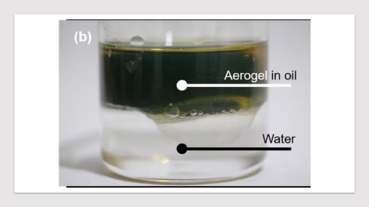 Sifat permukaan aerogel selulosa yang banyak mengandung gugus hidroksil memungkinkannya untuk dimodifikasi sehingga memiliki sifat tertentu. Di atas ditunjukkan bahwa aerogel selulosa mampu menyerap air dengan kapasitas yang tinggi. Apabila permukaan aerogel selulosa ini dimodifikasi sehingga berubah dari hidrofil menjadi hidrofob (olefil), bahan ini memiliki peluang untuk dipakai sebagai pembersih tumpahan minyak. Kami menggunakan tetrametil khlorosilan (TMCS) dan hidroksimetildisilasan (HMDS), permukaan aerogel untuk memodifikasi permukaan aerogel selulosa menjadi hidrofob (oleofil). Aerogel yang sudah dimodifikas ini mampu menyerap minyak dalam campuran minyak-air tanpa sedikitpun air yang ikut terserap (Gambar 4). Dengan sifatnya tersebut aerogel selulosa ini bisa dipakai sebagai bahan ramah lingkungan dan biodegradabel untuk membersihkan tumpahan minyak di laut.
