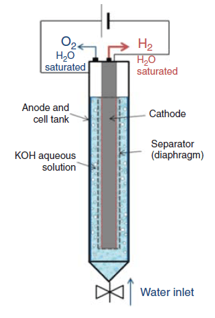 Keunggulan utama elektrolisa air basa dibandingkan teknologi elektrolisa air lain terletak pada fakta bahwa elektroliser basa dapat dibuat dari bahan yang melimpah dan murah. Elektroda untuk memproduksi hidrogen adalah besi biasa atau baja nikel dan untuk memproduksi oksigen adalah nikel. Dalam operasi praktis, tegangan sel terletak dalam kisaran 1,3-2,0 V. Pada anoda, yang dipolarisasi pada potensial yang mendekati 1,8-2,0 V (vs. SHE), ion OH– dioksidasi menurut Persamaan (1) menjadi gas oksigen. Ini adalah reaksi pelepasan oksigen (oxygen evolution reaction; EOR). Produksi hidrogen berlangsung di katoda, yang dipolarisasi pada potensial negatif (relatif terhadap SHE). Elektron yang berasal dari sirkuit listrik luar digunakan untuk mereduksi air dalam hidrogen gas, menjadi gelembung dalam elektrolit dan ion OH– (Persamaan 2). Ini adalah reaksi pelepasan hidrogen (hydrogen evolution reaction; HER).