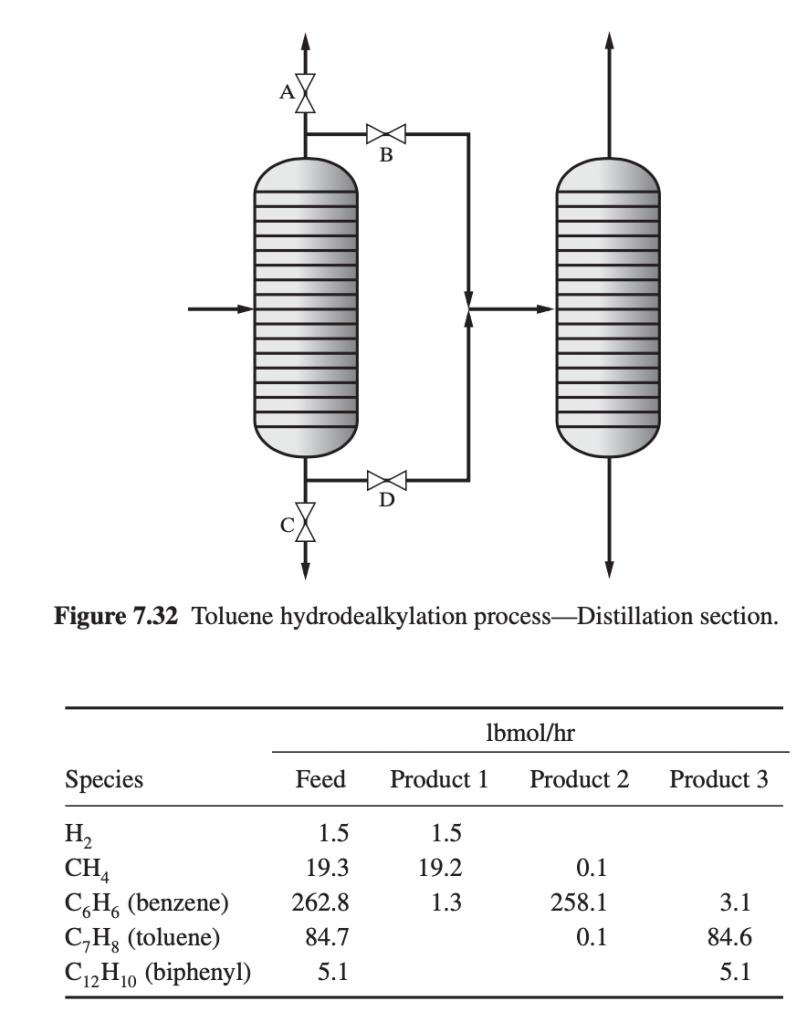 Melanjutkan simulasi sebelumnya tentang proses hidrodealkilasi toluena – sesi reaktor (Disini), aliran dari sesi reaktor pada 100∘F and 484 psia akan dipisahkan dengan dua kolom distilasi menjadi Product 1-3 dalam tabel berikut.