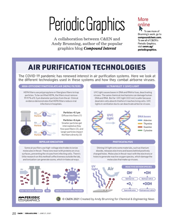 Majalah digital C&EN dalam terbitan bulan Juni 2021 (disini), bekerjasama dengan blogger pendidik kimia dan senyawa Andy Brunning, menjelaskan sains di belakang bagaimana berbagai macam metode pembersih udara menghilangkan virus seperti SARS-CoV-2 dari udara. Pandemi Covid-2019 telah memperbarui lagi daya tarik terhadap sistem pembersih udara. Empat teknologi yang digunakan dalam sistem ini dan bagaimana mereka memerangi virus di udara dijelaskan dalam bentuk grafik periodik (disini). Keempat teknologi tersebut adalah: (1) Filter HEPA, (2) Ionisasi bipolar, (3) sinar UVC, dan (4) Fotokatalisis.