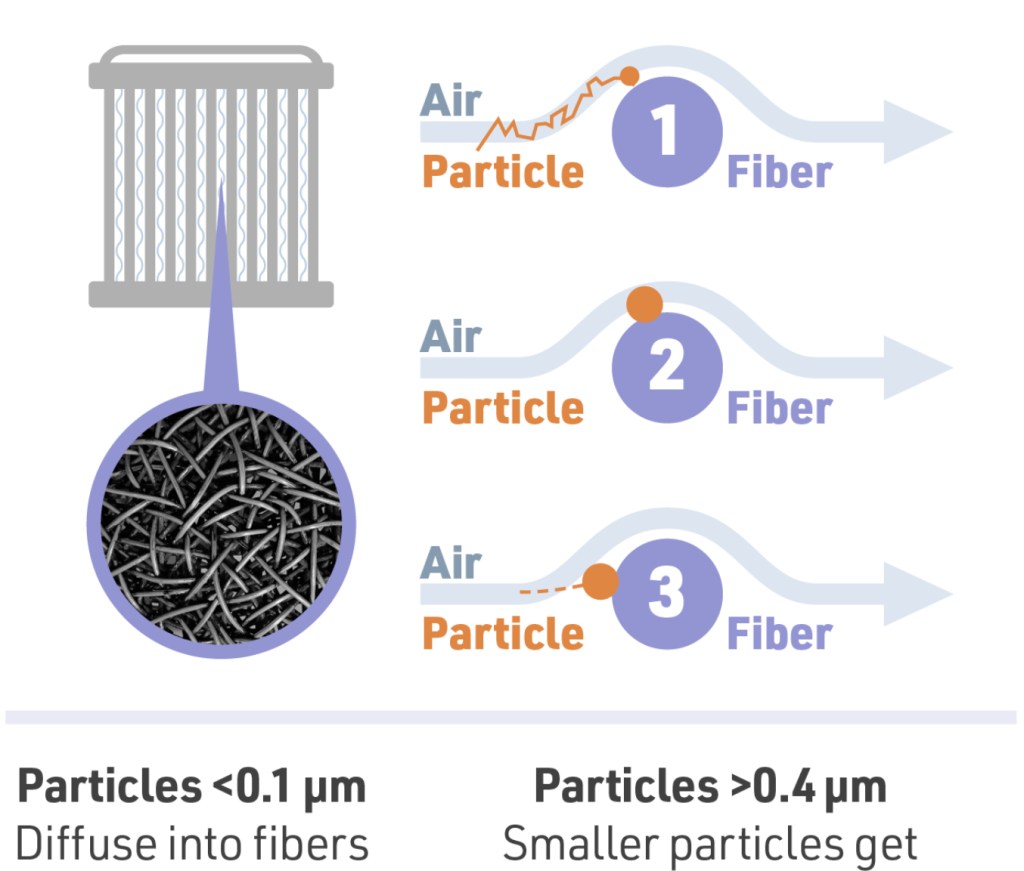 Ketika udara yang mengandung partikel melewati filter HEPA, partikel kecil yang berukuran < 0,1 mikrometer akan berdifusi ke dalam serat. Sementara itu, partikel besar yang berukuran > 0,4 mikrometer menabrak serat langsung, dan partikel yang lebih kecil menyinggung pinggiran serat ketika aliran melalui serat.