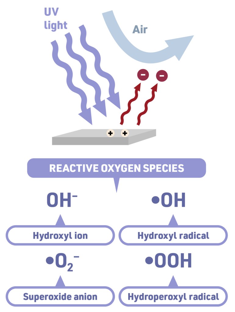 Sinar UV yang menyinari beberapa bahan, mis.: titanium dioksida, melepaskan elektron dan meninggalkan lubang bermuatan listrik positif. Molekul di udara bereaksi dengan elektron atau lubang untuk membangkitkan spesies oksigen reaktif, yang merusak molekul yang menyusun virus (lihat disini).
