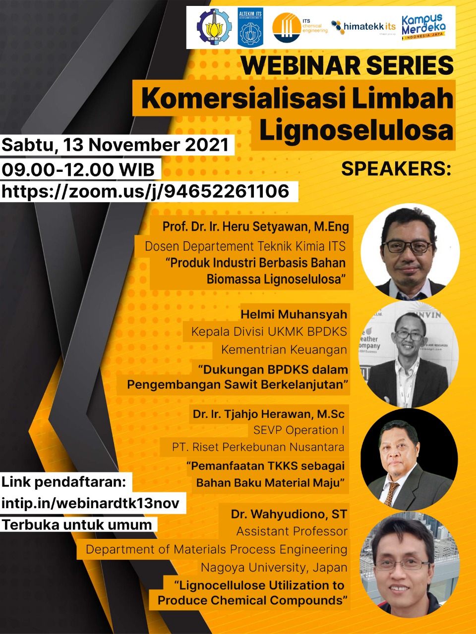 Webinar Series ini merupakan salah satu rangkaian dari webinar yang bertajuk “Komersialisasi limbah lignoselulosa” yang terdiri dari dua seri dan webinar hari ini (Sabtu, 13 Nov 2021) merupakan seri pertama, yang membahas pemanfataan limbah lignoselulosa menjadi materail bio dan senyawa kimia bio. Seri kedua akan diselenggarakan hari Jum’at minggu depan (26 Nov 2021) yang akan membahas lebih lanjut pemanfaatan limbah ligoselulosa menjadi sumber energi bio.
