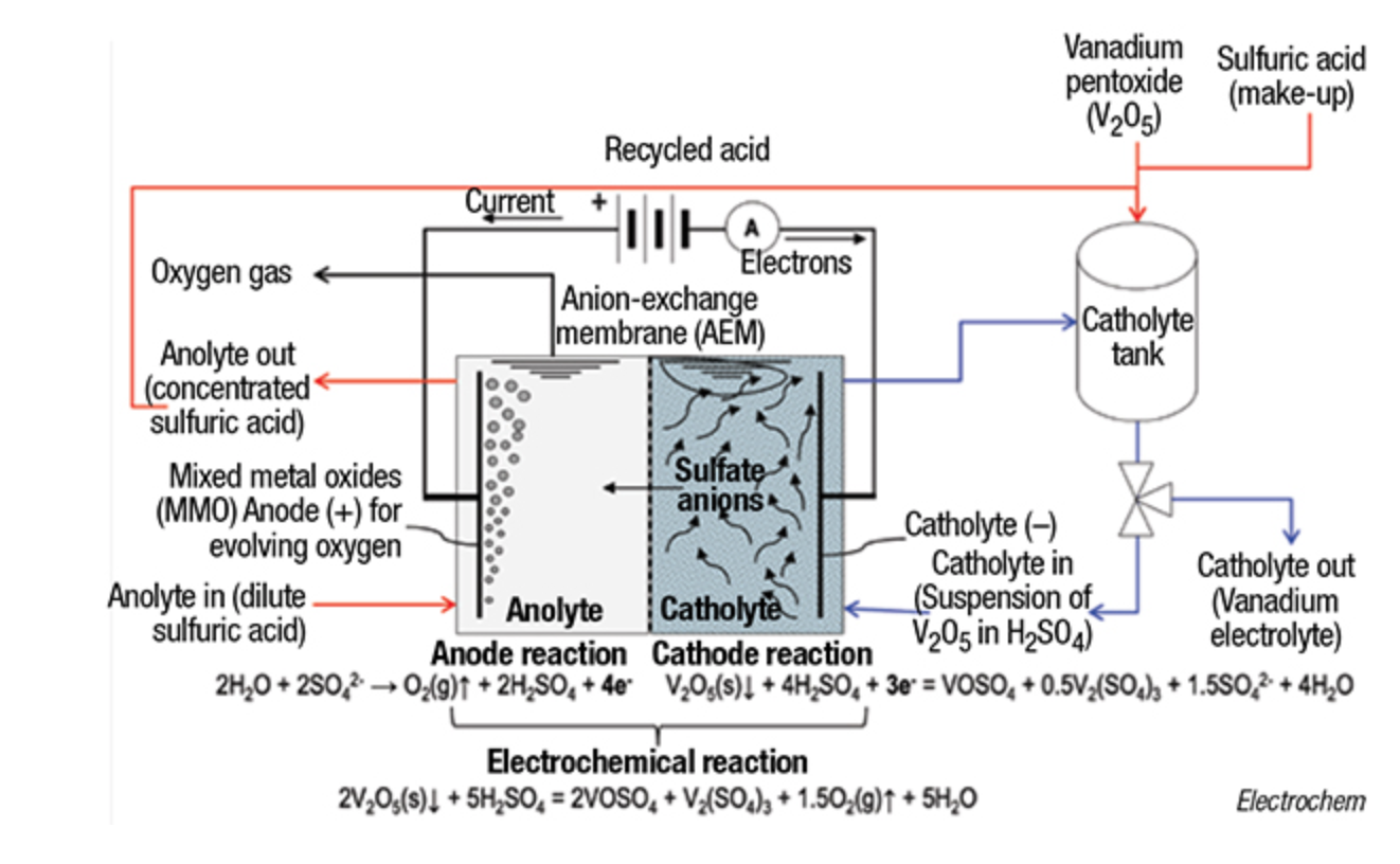 Berlawanan dengan proses industri saat ini, proses elektrokimia satu tahap hanya didorong oleh jumlah listrik yang dipasok, tanpa membutuhkan bahan kimia tambahan, karena reduksi hanya dilakukan oleh elektron yang disediakan pada katoda. Flowsheet proses yang dipatenkan ditunjukkan pada gambar di bawah. Suspensi (slurri) yang terdiri atas padatan V2O5 dan H2SO4 dielektrolisa dalam kompartemen katoda dari sebuah elektroliser terbagi dengan konfigurasi pelat-dan-kerangka (plate-and-frame) dan dipisahkan dengan membran penukar anion. Elektrolisa dilakukan sampai katolit, yang terdiri dari larutan asam ekuimolar vanadium (III) dan vanadium (IV) sulfat, akhirnya dihasilkan. Sementara itu, dalam kompartemen anoda, anolit (larutan encer H2SO4) dipekatkan sampai konsentrasi maksimal H2SO4 tercapai dan ini dapat dipakai lagi dengan tambahan H2SO4 untuk memproduksi batch baru katolit.