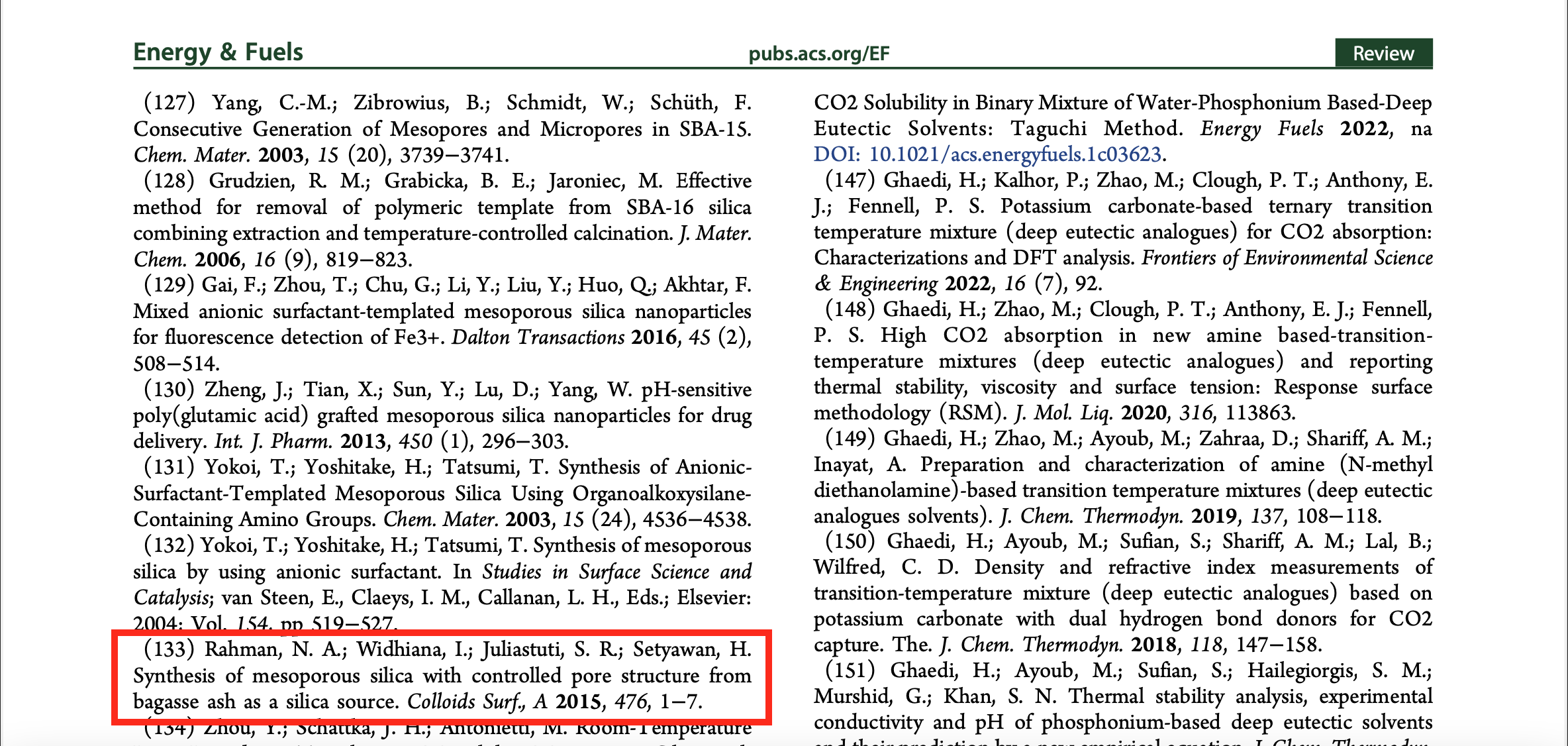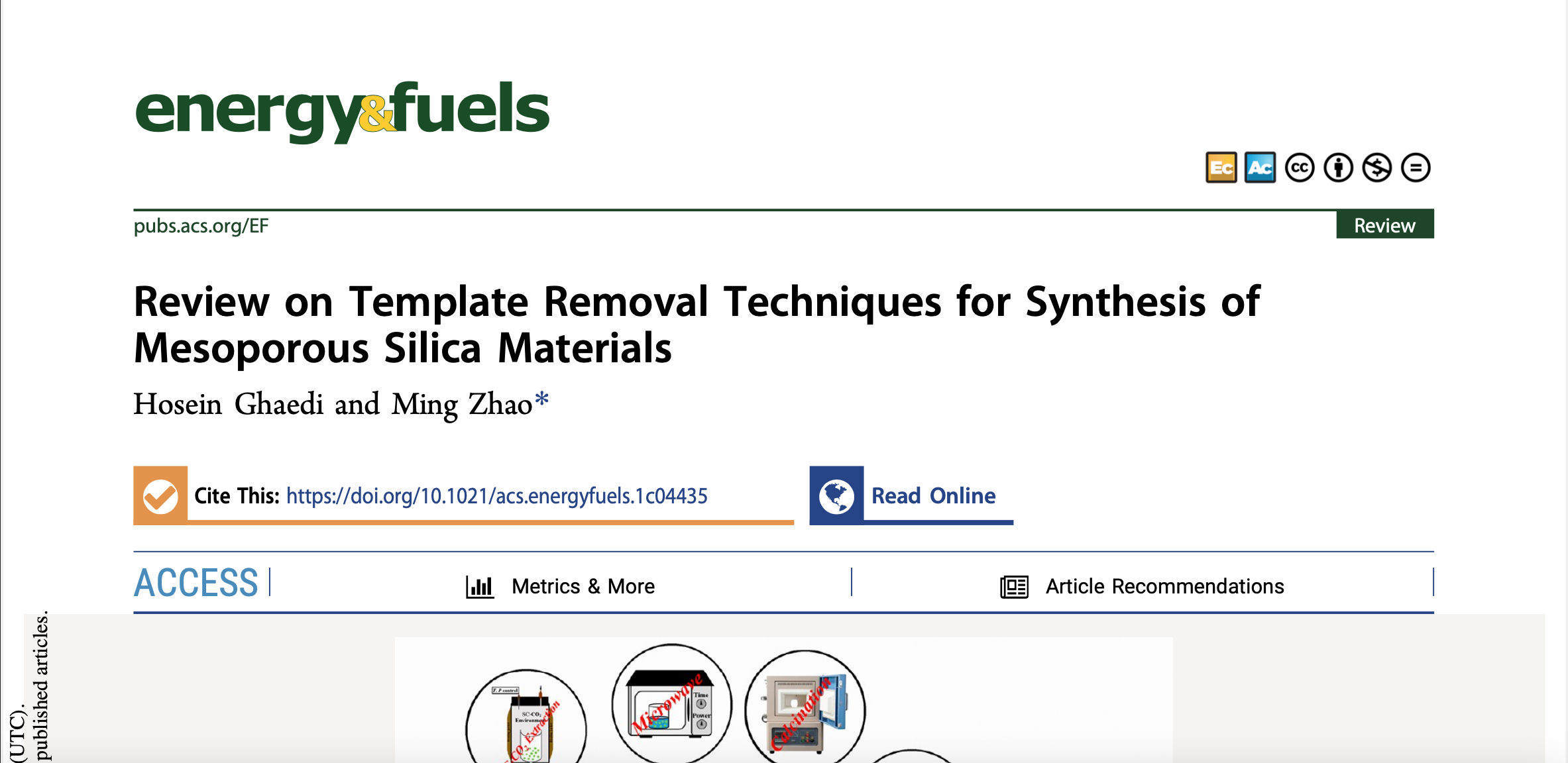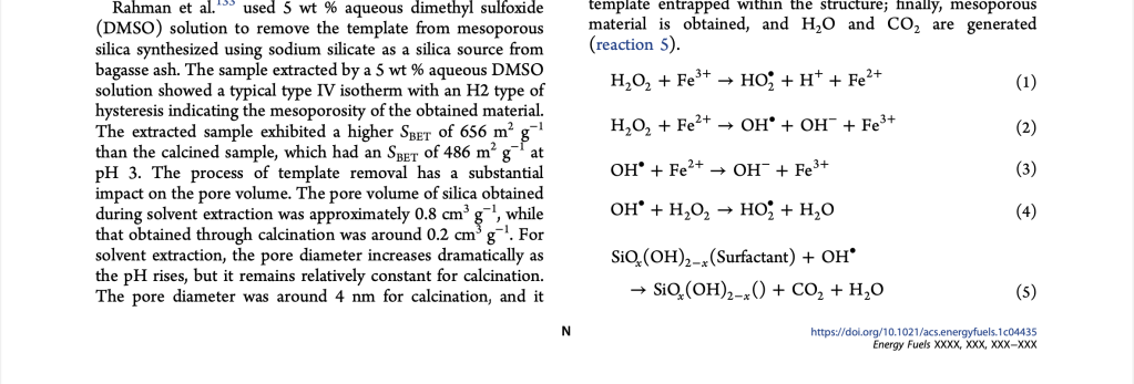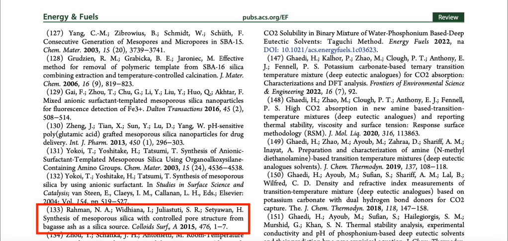Tahap kunci dalam pembuatan bahan silika mesopori adalah penghilangan cetakan yang terjebak di dalam pori-pori. Metode yang paling umum adalah kalsinasi konvensional pada 550oC dalam udara, yang bisa menyebabkan penyusutan, runtuhnya struktur pori-pori, berkurangnya konsentrasi silanol pada dinding, dan pembentukan CO2 dan senyawa amina dalam jumlah besar. Oleh sebab itu banyak usaha dilakukan untuk mengembangkan metode baru yang menguntungkan dari sudut pandang ekonomi dan lingkungan. Salah satunya adalah metode penghilangan cetakan PEG dengan solvothermal menggunakan DMSO untuk membuat mesopori silika dari abu bagasse (Colloids Surf A, 476,1, 2015). Metode ini menjadi salah satu yang dibicarakan dalam review paper yang terbit baru-baru ini di Energy & Fuels yang diterbitkan oleh American Chemical Society. Artikel ini menjadi ACS Editor’s Choice dan bersifat Open Access.
