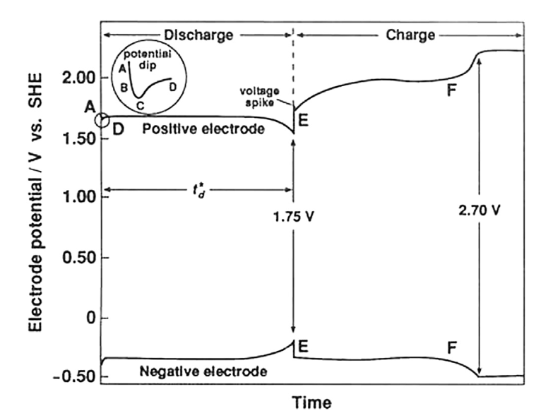 Kurva pemakaian dan pengisian untuk elektroda positif dan negatif pada sel timbal-asam diilustrasikan pada Gambar 1. Begitu beban dikenakan, ada penurunan sesaat pada tegangan sel (region A). Pengaruh ini disebabkan oleh pembatasan elektrokinetika dan perpindahan massa dalam sel. Daerah miring pada kurva (region B) timbul dari kapasitas lapisan ganda. Hambatan dalam sel timbal-asam dalam keadaan terisi penuh mempunyai nilai dalam tingkan miliohm; nilai pastinya tergantung pada rancangan dan ukuran sel, metoda yang dipakai untuk pembuatan pelat, dan suhu. Hambatan sel meningkat selama pemakaian karena bahan pelat diubah menjadi timbal sulfat dan larutan elektrolit asamanya semakin menipis. Yang pertama diendapkan dalam pori-pori bahan aktif dan dengan begitu menghambat akses asam. Pengaruh penutupan pori-pori timbal adalah masalah khusus pada laju pemakaian tinggi. Penurunan suhu juga menghalangi difusi asam, dan selain itu, memperlambat aliran konveksi dengan meningkatkan viskositas larutan elektrolit.