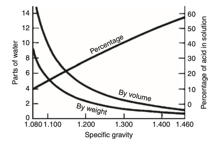 Specific gravity (s.g.) untuk beberapa jenis rancangan baterai timbal-asam (Tabel 2) dan perubahan s.g. pada keadaan muatan yang berbeda (Tabel 3) dapat dilihat disini. Perbandingan dengan data titik beku akan menunjukkan bahwa baterai tipe A akan membeku pada -30oC ketika terisi penuh, sedangkan baterai tipe D akan membeku pada sekitar -5oC, sebuah faktor yang harus dipertimbangkan dalam merancang baterai dan rumah baterai. Konsentrasi asama untuk sebagian besar baterai timbal-asam untuk pemakaian di daerah iklim dengan suhu sedang biasanya antara s.g. 1,26 dan 1,28. Elektrolit dengan konsentrasi lebih tinggi cenderung menyerang separator dan komponen lain; konsentrasi lebih rendah cenderung tidak memadai untuk menghantarkan ion pada sel yang terisi sebagian dan membeku pada suhu rendah. Pada daerah dengan iklim bersuhu tinggi, digunakan konsentrasi yang lebih rendah, dan pada sel stasioner dengan volume elektrolit lebih besar dan tidak dibutuhkan kapasitas tinggi, dipakai elektrolit dengan s.g. serendah 1,21.