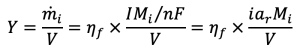 dimana mi adalah massa produk, Q adalah muatan listrik total yang dialirkan selama elektrolisa, mi<titik atas> adalah laju alir massa (massa/waktu) produk yang diinginkan, n adalah jumlah elektron yang terlibat dalam reaksi, F adalah tetapan Faraday dan I adalah arus total (dianggap konstan). Dalam hal terbentuk produk lebih dari satu, efisiensi Faraday setiap produk bisa berbeda. Ingat bahwa efisiensi Faraday tidak bersatuan dan mempunyai nilai yang sama jika didasarkan pada massa, mol atau ampere karena ini dihitung untuk spesies kimia tunggal.