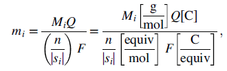 Meskipun Persamaan (6) dan (7) bermanfaat, aspek penting dari uraian di sini adalah proses yang digunakan untuk mengembangkan persamaan. Dimulai dengan muatan Q dalam satuan standar [C], yang kemudian dihubungkan dengan arus dalam [A] sebagai fungsi waktu. Muatan tersebut kemudian dikonversi ke mol elektron (ekivalen). Mol elektron kemudian dihubungkan melalui reaksi setengah sel dengan mol spesies i yang direaksikan atau dikonsumsi. Akhirnya, berat molekul digunakan untuk mengkonversi mol ke massa spesies yang diinginkan.