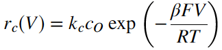 Agar dapat dengan mudah diterapkan, Persamaan (2) biasanya dinyatakan sebagai kecepatan reaksi katodik dan anodik dalam istilah potensial V. Kecepatan reaksi katodik dapat dinyatakan sebagai