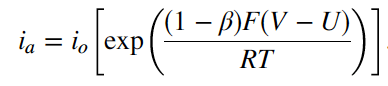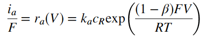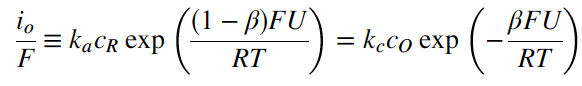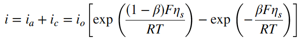 Persamaan ini dikenal dengan persamaan Butler-Volmer (BV), yang ditunjukkan di sini adalah untuk reaksi elementer yang melibatkan transfer elektron tunggal. Nilai beta untuk jenis reaksi ini umumnya ~0,5.