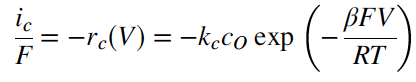 Agar dapat dengan mudah diterapkan, Persamaan (2) biasanya dinyatakan sebagai kecepatan reaksi katodik dan anodik dalam istilah potensial V. Kecepatan reaksi katodik dapat dinyatakan sebagai