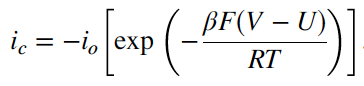 Persamaan ini dikenal dengan persamaan Butler-Volmer (BV), yang ditunjukkan di sini adalah untuk reaksi elementer yang melibatkan transfer elektron tunggal. Nilai beta untuk jenis reaksi ini umumnya ~0,5.