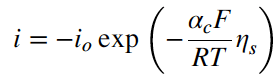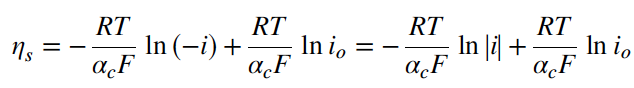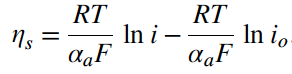 Persamaan yang disederhanakan ini disebut persamaan Tafel. Persamaan ini dapat segera diselesaikan untuk overpotensial sebagai fungsi arus: