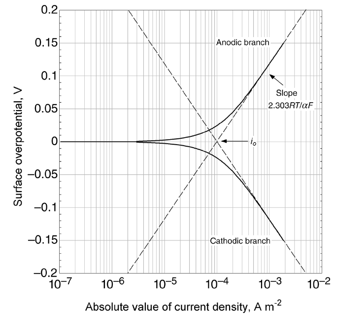 Ingat bahwa i < 0 adalah untuk arus katodik sehingga –i harus positif ketika arus harus dimasukkan dalam logaritma. Untuk menekankan ini, nilai absolut dimasukkan dalam suku terakhir Persamaan (6) dan perwakilan grafik dari persamaan tersebut. Kemiringan kurva katodik adalah negatif. Plot Tafel klasik ditunjukkan pada Gambar 1 untuk hs sebagai fungsi log |i|. Keduanya garis Tafel anodik dan katodik telah dimasukkan, yang bertemu pada hs = 0, dimana |i| = io. Nilai absolut arus dari persamaan BV lengkap juga ditunjukkan. Persamaan Tafel dan pendekatan BV lengkap adalah identik pada overpotensial tinggi, tetapi menyimpang ketika overpotensial mendekati nol. Plot seperti ini bermanfaat untuk pengepasan parameter dengan data percobaan. Jenis plot seperti ini juga telah secara luas digunakan untuk mengamalisa sistem korosi, salah satunya.
