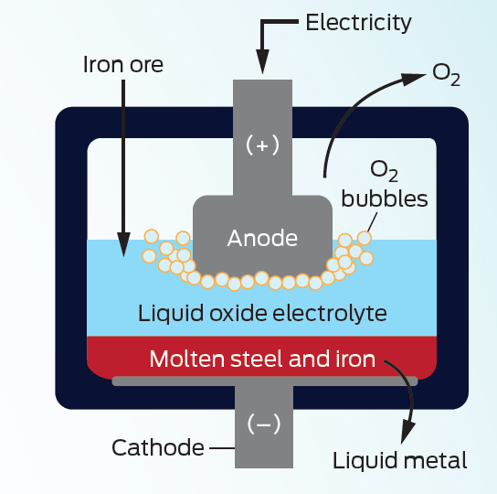 Cara lain yang diusulkan yang dipandang lebih ekonomis adalah menggunakan listrik terbarukan untuk mereduksi besi oksida. Ini dipelopori oleh spin-off Massachusetts Institute of Technology (MIT) Boston Metal dengan proses yang disebut elektrolisa oksida leburan (molten oxide electrolysis) (Nature 2013, DOI: 10.1038/nature12134). Proses elektrokimia terjadi dalam bejana baja berlapis batu alumina dengan anoda menjorok ke bawah dari atas dan katoda horisontal di dasar. Di dalam bejana, besi oksida terlarut dalam campuran leburan logam oksida seperti silika, magnesia dan kapur, semua dipanaskan sampai 1600 oC oleh arus listrik. Pada katoda, arus ini mereduksi ion besi membentuk genangan cairan besi yang dapat dikirim ke tanur busur listrik. Tahap pembuatan pelet biji besi yang membutuhkan banyak energi tidak diperlukan sehingga proses ini dipandang lebih hemat energi dibandingkan rute berbasis hidrogen.