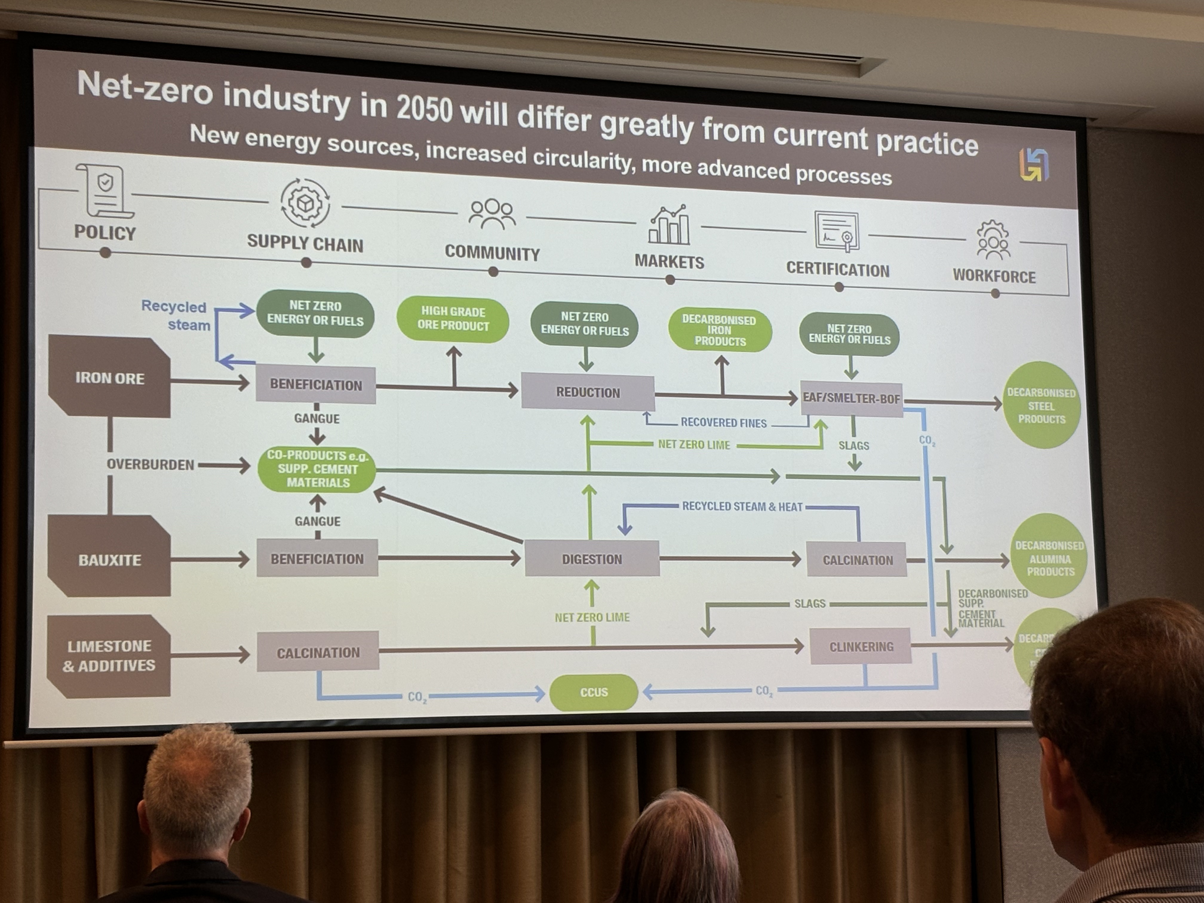 Industri nol bersih pada tahun 2050 akan sangat berbeda dengan praktik saat ini, baik dari sisi kebijakan, rantai pasok, masyarakat, pasar, sertifikasi dan tempat kerja. Sumber energi baru, peningkatan sirkularitas dan proses lebih maju akan lebih mendominasi. Dalam bidang pemrosesan mineral, proses benefiasi menjadi tantangan utama, misal untuk pengolahan biji besi dan bauksit. Teknologi utama saat ini untuk mendapatkan logam kualitas tinggi adalah dengan proses smelter dimana logam dalam bentuk oksida (besi oksida, alumina) dilebur dan direduksi pada suhu tinggi yang membutuhkan konsumsi listrik sangat besar dan bahan pereduksi, umumnya karbon (grafit, dsb). Sirkulasi CO2 melalui teknologi CCUS mungkin bisa menjadi solusi untuk memproduksi logam dengan emisi karbon nol. Pemakaian bahan pereduksi hidrogen juga bisa menjadi alternatif meskipun saat ini TKT nya masih rendah dan belum terbukti proposisi nilainya.