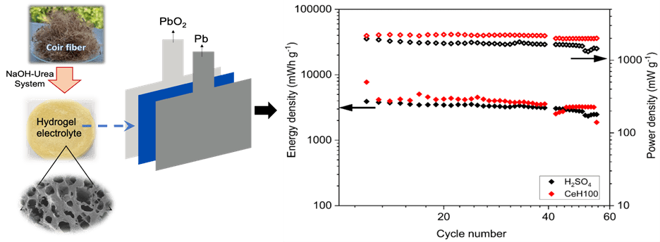 Masih berkaitan dengan sabut kelapa, Dr. Nur Shiyama Purnama Sari memaparkan disertasinya tentang elektrolit hidrogel untuk baterai timbal-asam, atau sehari-hari dikenal dengan aki. Baterai jenis ini menguasai pasar baterai di seluruh dunia, yang digunakan untuk otomotif, baterai cadangan, baterai penyimpan energi pembangkit listrik tenaga surya (PLTS), dan masih banyak lagi. Dalam keadaan cair, meskipun lambat, elektrolit di dalam aki akan mengalami penguapan sehingga secara berkala harus ditambahkan aquadest. Untuk menanggulangi hal ini, gel polimer elektrolit, umumnya berbasis fumed silica, dibuat untuk mengimobilisasi elektrolit. Ini bisa mencegah penguapan dan bisa menghilangkan kegiatan perawatan penggantian pelarut berkala. Dr. Ima menawarkan hidrogel selulosa, yang lebih murah dan ramah lingkungan, untuk menggantikan fumed silica yang harganya mahal dan pembuatannya rumit. Temuan kunci riset ini adalah teknik membuat hidrogel selulosa dari sabut kelapa yang memiliki kekuatan mekanik yang memadai, kemampuan menahan elektrolit sampai 820% dari keringnya, dan yang tidak kalah penting konduktivitas ionnya dapat disetarakan dengan larutan asam sulfat bebas (tidak diimobilisasi). Temuan ini telah dipublikasikan di Energy Technology.