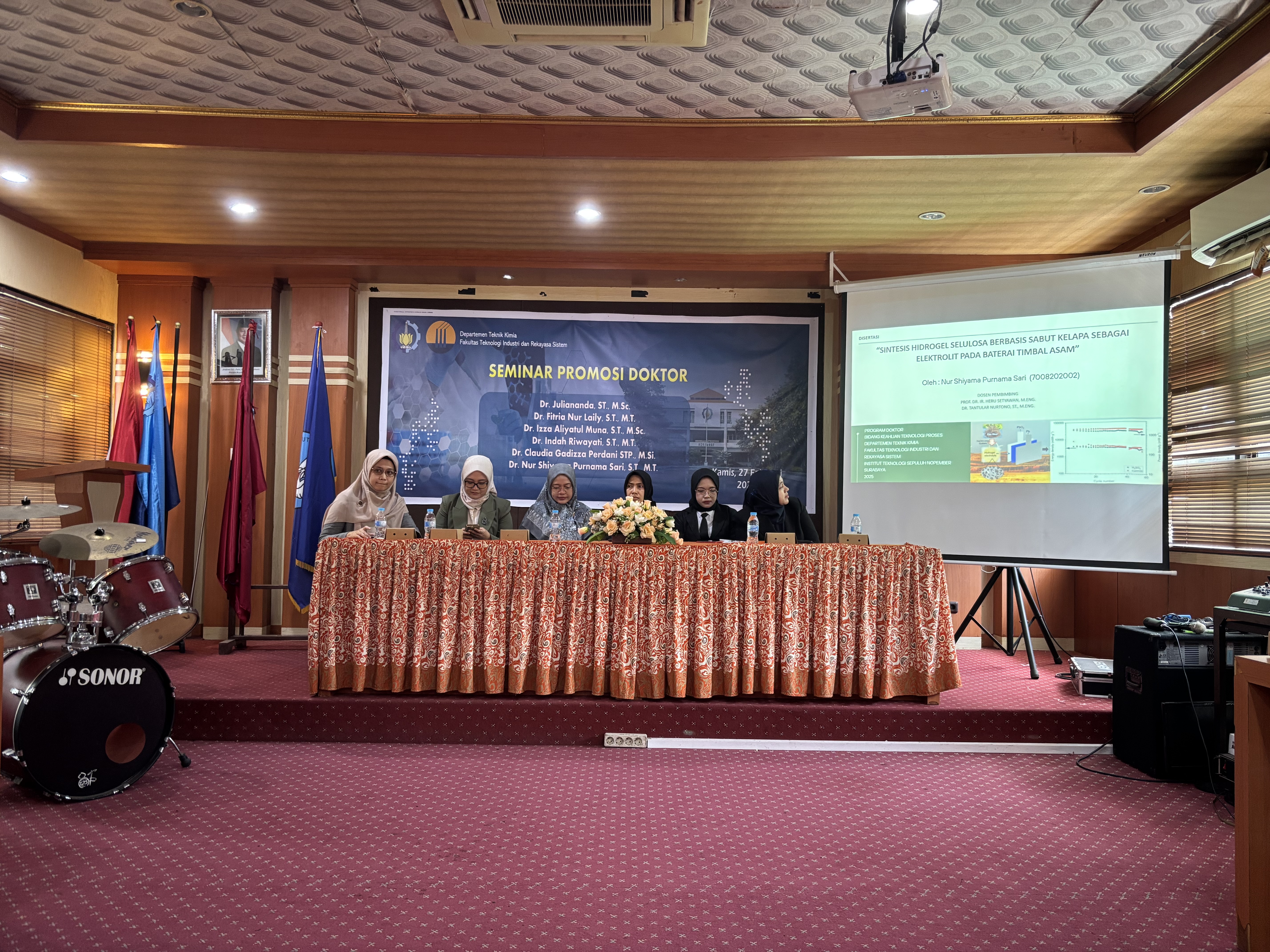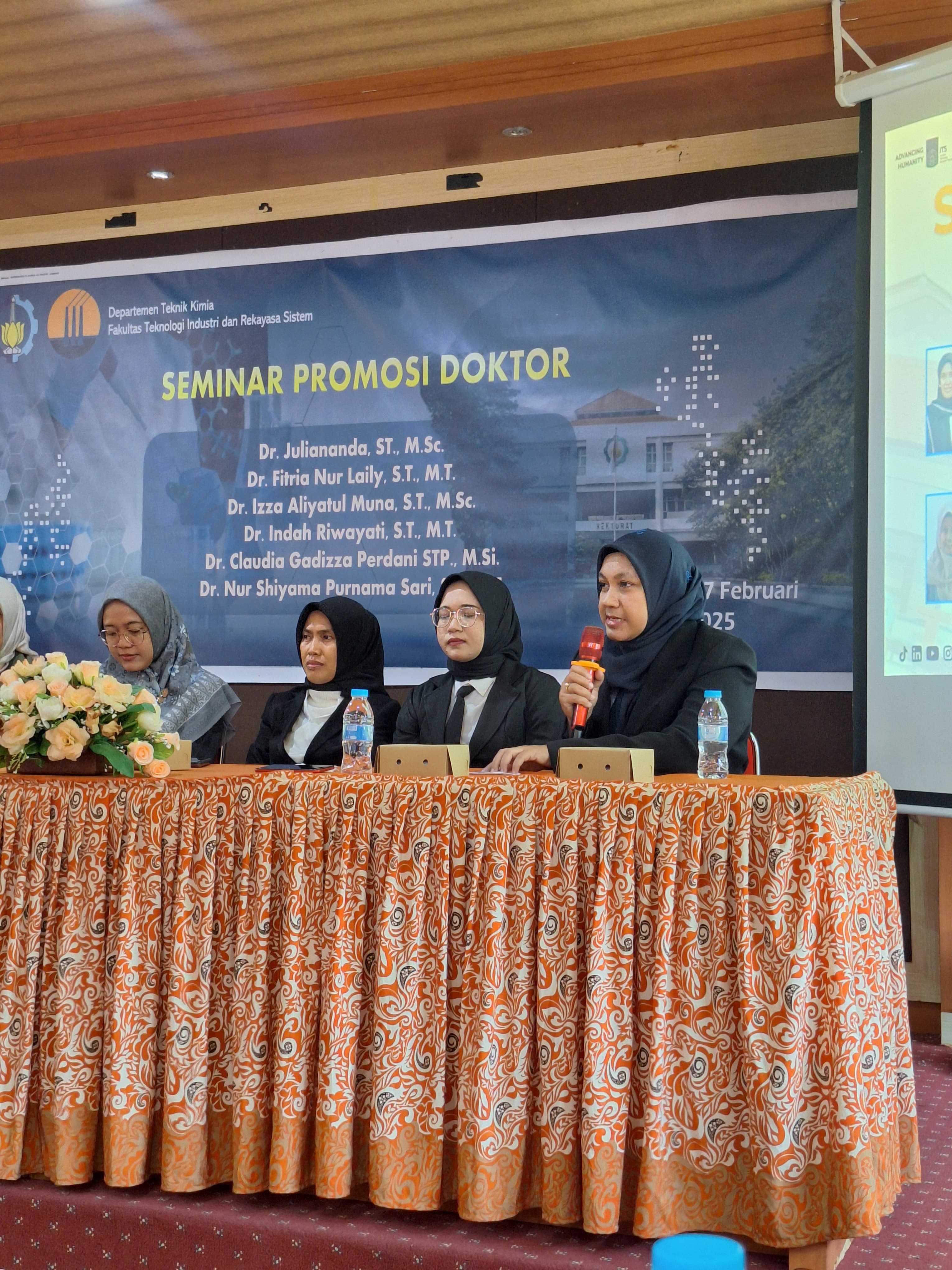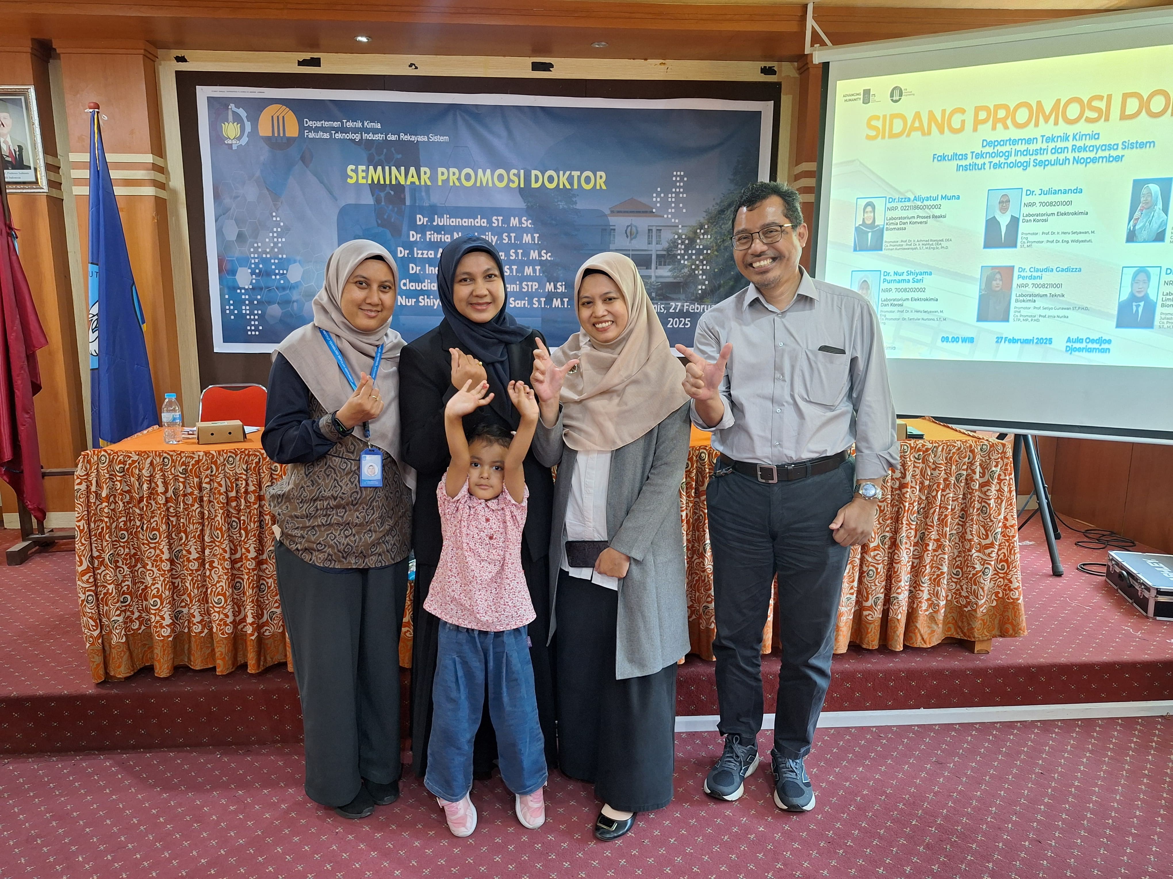 Hari ini, Kamis 27/2/2025, Departemen Teknik Kimia ITS mengadakan sidang promosi untuk enam doktor baru yang akan diwisuda bulan April nanti. Dari enam doktor baru tersebut, dua diantaranya dari Lab Elektrokimia dan Korosi, yaitu: Dr. Juliananda dan Dr. Nur Shiyama Purnama Sari.